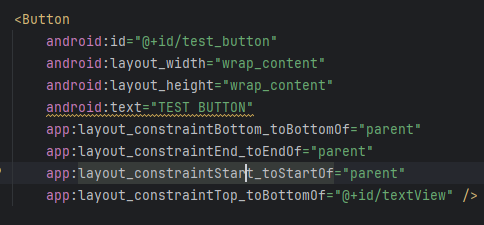 android studio에서는 버튼을 추가하면 빨간색 박스와 같이 추가한 버튼에 대한 코드를 자동으로 추가해주는 기능이 있는듯 하다. 여기서 버튼의 id를 확인 가능하고, 우리가 추가한 button의 id는 "button"이다. 이는 기본값이라고 생각되니, 이를 "test_button"으로 수정해 줄 것이다.