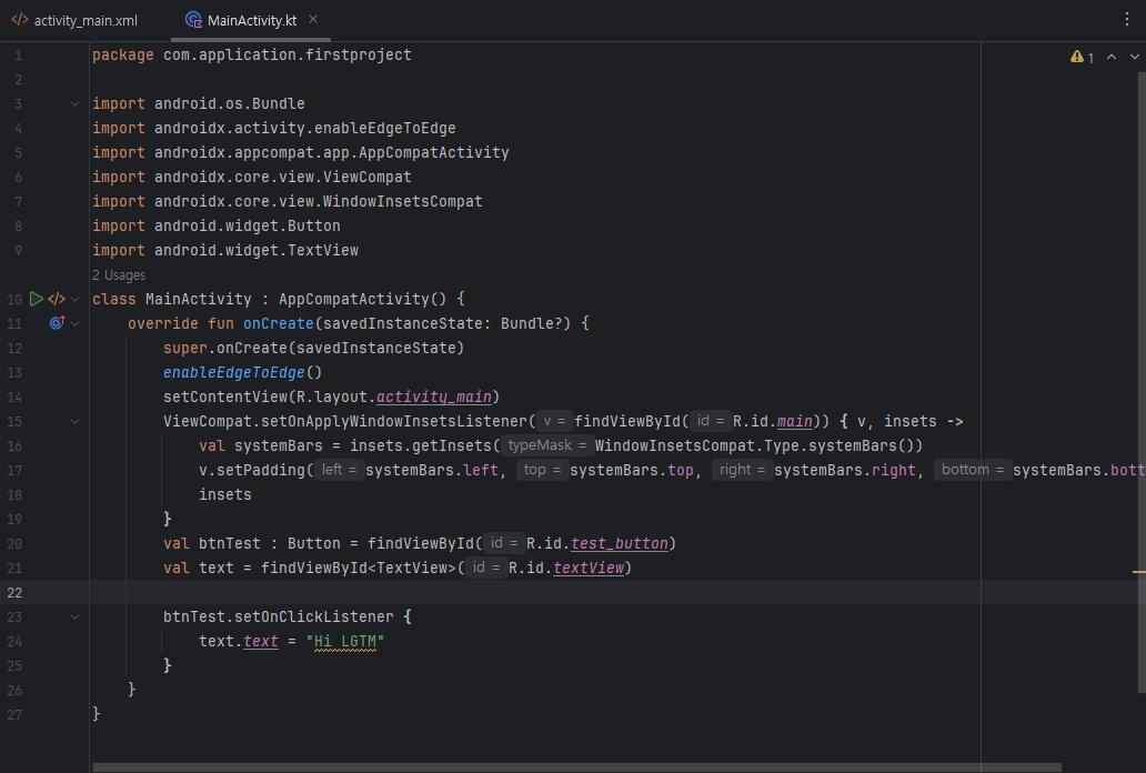 현재 "TextView"의 id는 기본값인 "textView"로 설정되어 있음을 확인했다. 이제 이 또한 버튼과 동일하게 TextView변수를 "MainActivity.kt"에 추가하도록 하자.